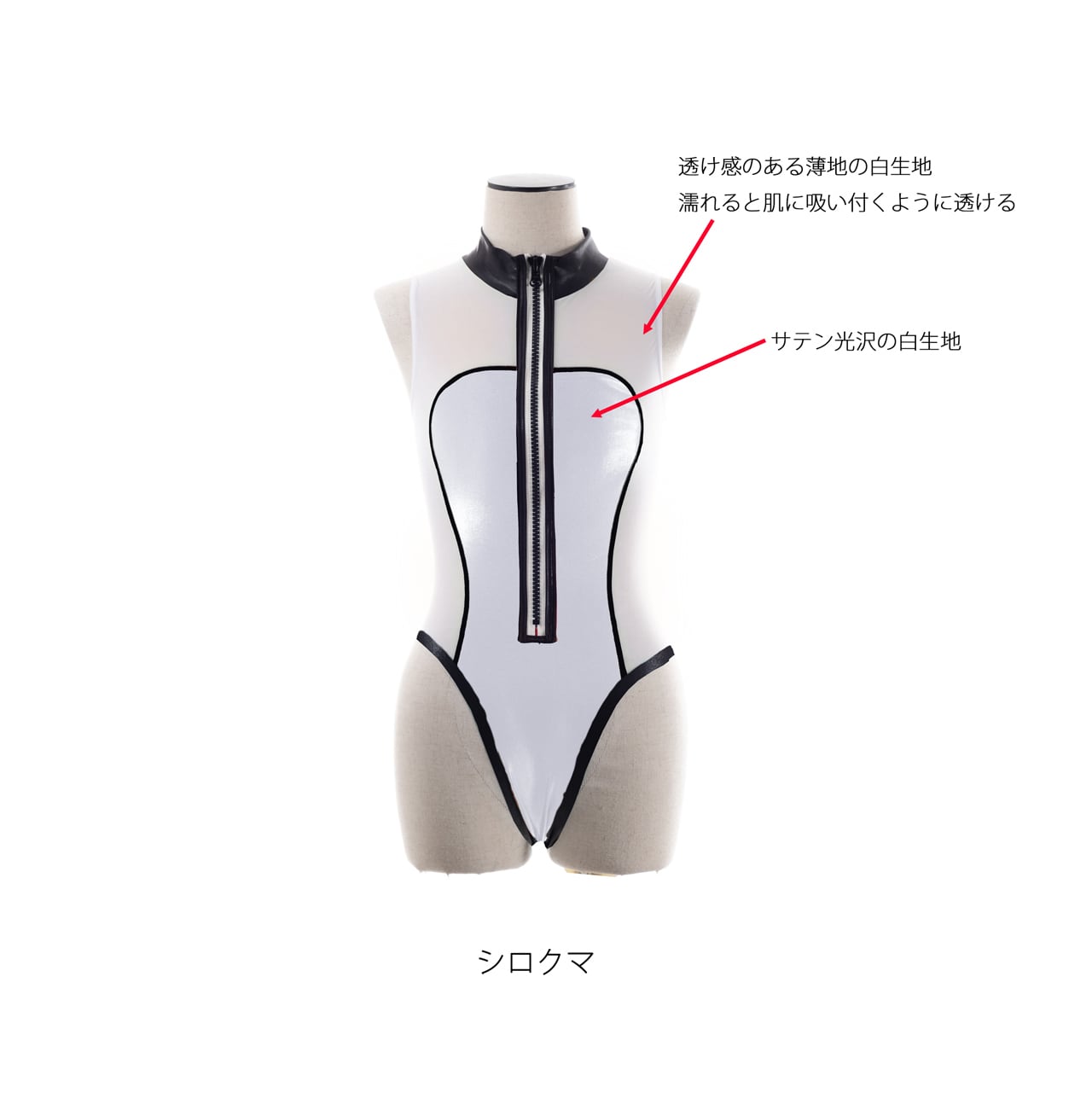 水着外側の白色部分は水に濡れる前は少し透け感のある白、濡れると肌に張り付き透けが増します。